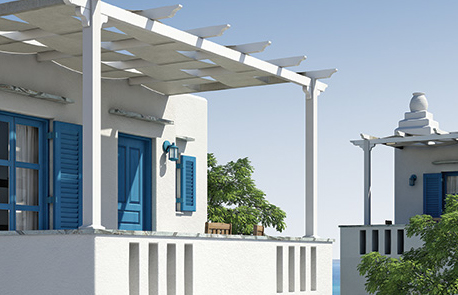 Σύστημα πέργκολας με περιστρεφόμενες περσίδες για ρυθμιζόμενη σκίαση και προστασία από τη βροχή. Ιδανική για τη μετατροπή ενός ανοιχτού χώρου σε ένα άνετο και ευχάριστο περιβάλλον. Η Μykonos υιοθετεί τη βιοκλιματική λογική και εγγυάται ελεγχόμενες συνθήκες διαβίωσης, και προσφέρει minimal και κομψές κατασκευές έως 6.2 x 4.5 m.